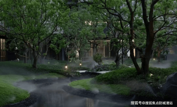 园林内部规划花境、水境、林境三大主题景观区,通过灵动的曲线与水系,营造出极具美感的空间景致。林下剧场以曲线为笔、流水为韵,蜿蜒的步道串联起密林与休憩区,让业主在都市中也能享受沉浸式森居体验;水上休闲平台选用普拉达绿大理石栏杆与黑色流水板岩池底,搭配镜水面设计,倒映云影天光,尽显奢雅意境。