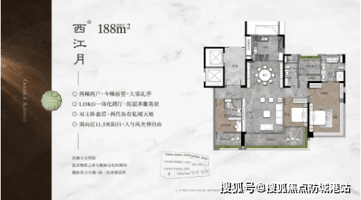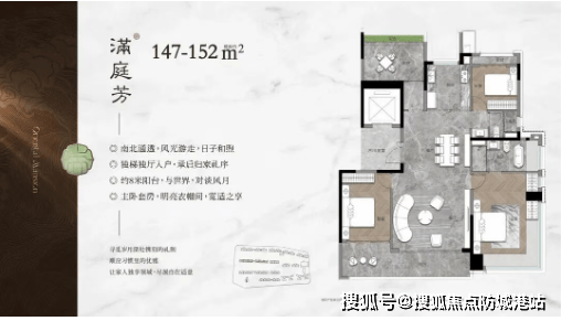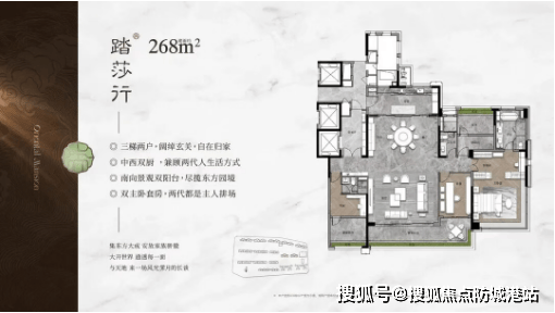 约268㎡四房两厅三卫:大面积户型,专梯入户,私密性强,配备超大阳台和全景飘窗,享有极佳的视野。