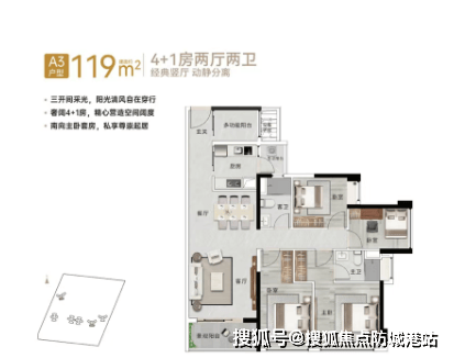 119㎡ 4+1房2厅2卫(竖厅/横厅):单边位布局,南向奢阔主套,配独立衣帽间,改善户型首选。