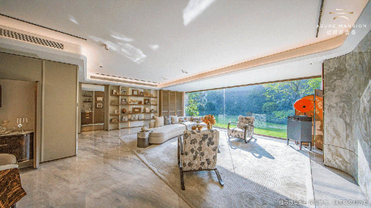 客厅采用弧形吊顶搭配四边灯槽,营造出柔和的空间氛围。客餐厅通铺马可波罗(或同等品牌)大规格灰色大理石纹瓷砖,纹理自然细腻,增强了空间的整体感。卧室同样采用弧形吊顶,配合大面积玻璃窗,使得整个房间显得高挑敞亮。