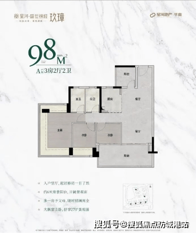 其中,98㎡户型进行了全新升级,主朝向朝南,让阳光洒满每一个角落。该户型的最大亮点在于主卧配备了270°无柱飘窗,视野开阔,美景尽收眼底。同时,次卧和阳台的尺度也大幅增加,无论是作为儿童的游乐空间,还是主人的休闲角落,都能提供更加从容的体验。