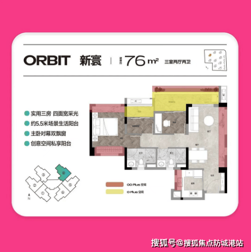 约74㎡三房两厅真两卫:5.5米大阳台,四开间采光,超83%标准层实用率。