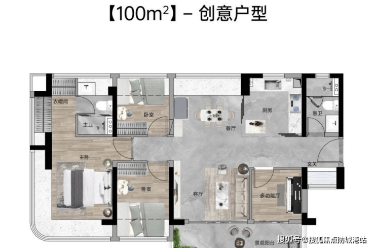 80㎡三房两厅两卫:东南向,使用率107%,四开间南向,12.6米超大面宽,主卧270°弧形玻璃幕窗。