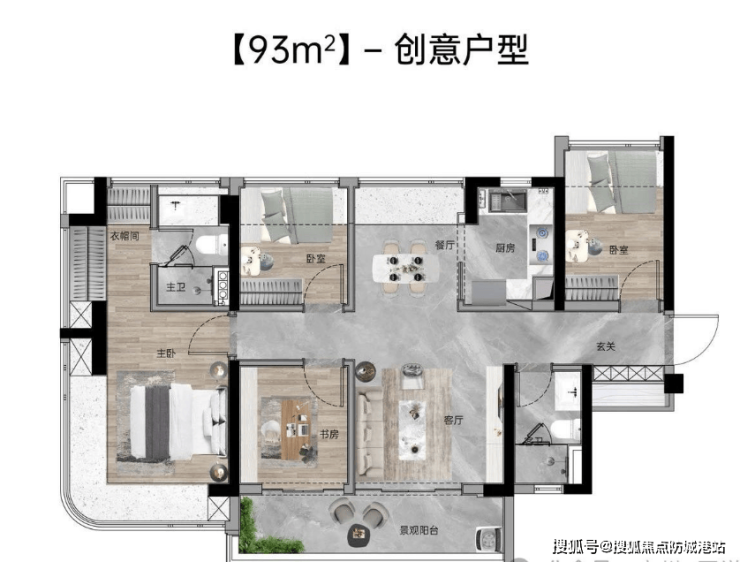 93㎡四房两厅两卫:东南向,使用率109%,独立入户玄关,南北通透,四面宽极致视野,主卧270°主卧弧形玻璃幕窗。