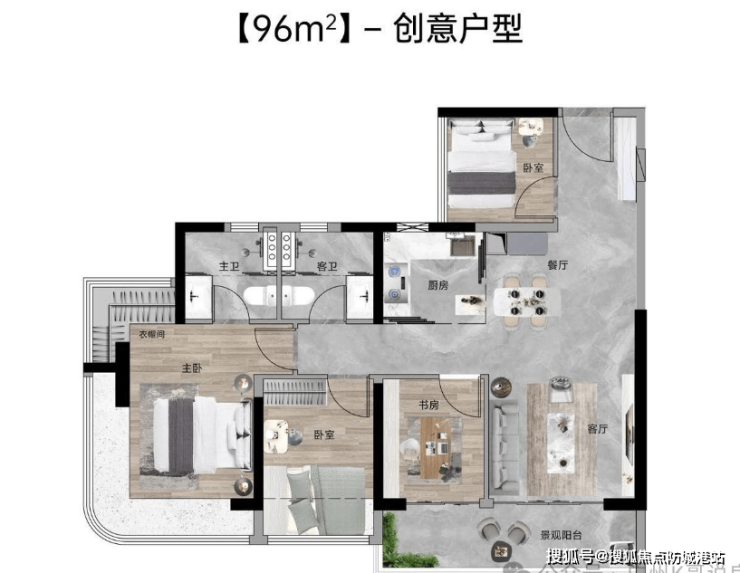 96㎡四房两厅两卫:西南向,使用率100%,约5.7米面宽瞰山阳台,主卧270°主卧弧形玻璃幕窗。