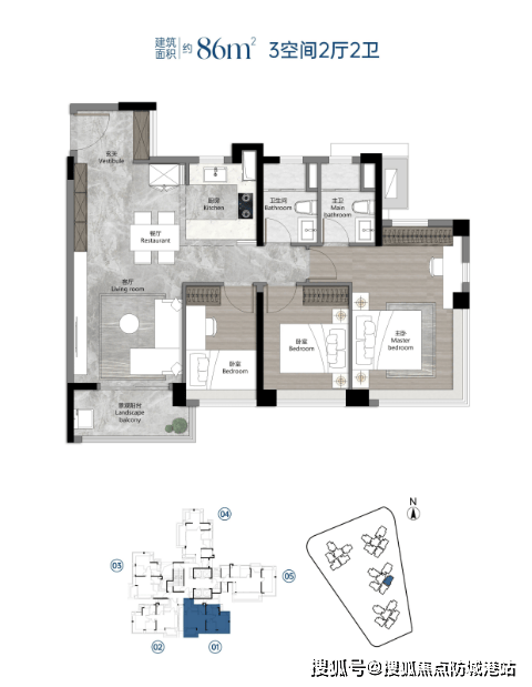 (1)建面约86㎡三房两厅一卫:刚需主力户型,紧凑实用,适配年轻家庭