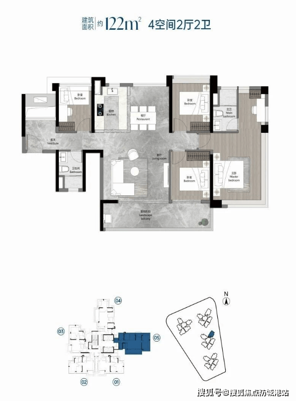 (4)建面约122㎡四房两厅两卫:改善型户型,空间开阔,适配高品质居住需求