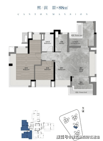 (2)建面约88㎡三房两厅两卫:南向三开间,私密性强,适配三口之家