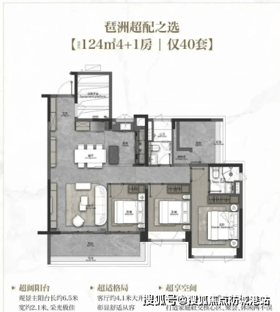123㎡四房:创新性地打造了4+1房,每个空间都有足够的舒适感,四开间朝南,双面宽景观阳台长约6.5米。