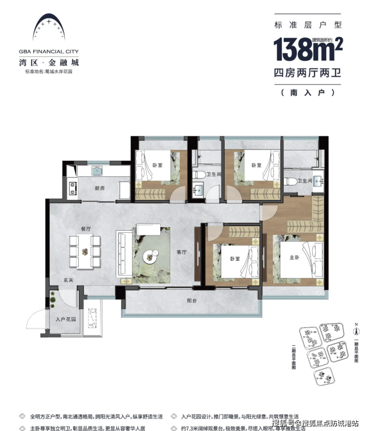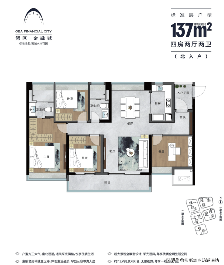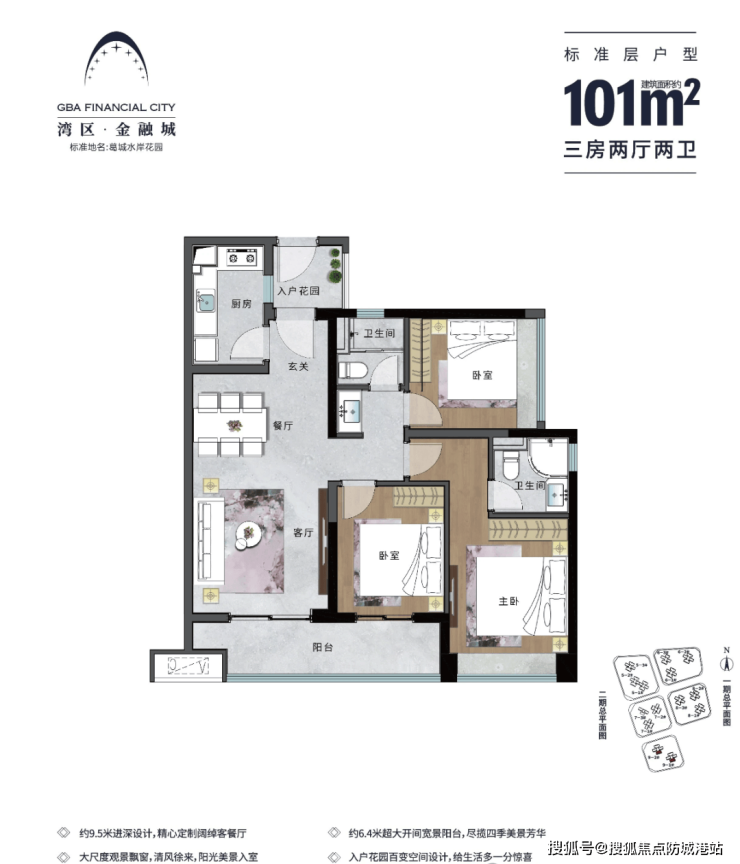 能建·湾区金融城目前主推二期7地块和9地块的多种户型,涵盖从约70平方米至约142平方米的两房至四房住宅。特别是约90平方米的三房两厅两卫户型,部分设计有入户花园,优阔主卧套房与宽大景观阳台相结合,提供了舒适的居住体验。而约137平方米和138平方米的四房户型则做到了南北通透,通风采光俱佳,超大景观全飘窗设计更显奢华。