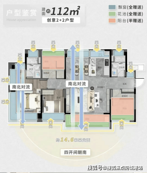112平方米四房两厅两卫:该户型设计宽敞舒适,客厅面宽约5.2米,配有罕见的三阳台设计,拓展了生活空间。主卧配备270°观景飘窗,视野开阔。
