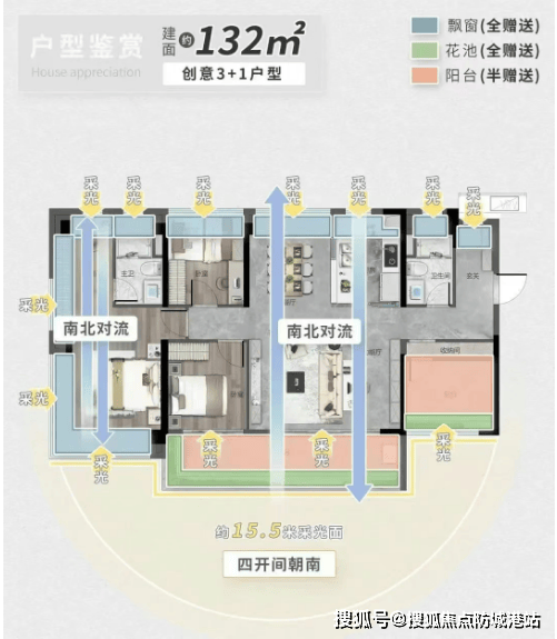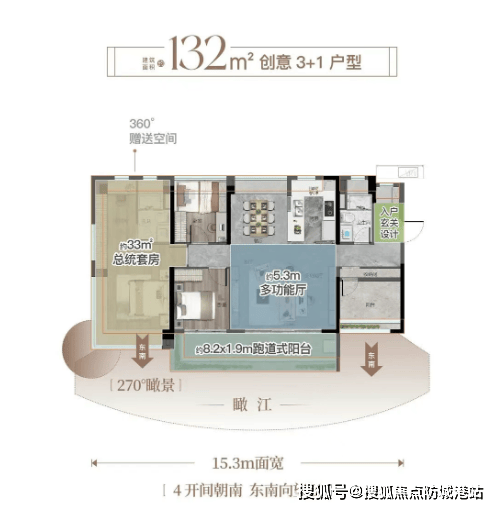 132平方米四房两厅两卫:此户型拥有约8.2*1.9米的跑道式阳台,适合赏景休闲。南望江北瞰园,享受IMAX无遮挡视野。主卧面积约33平方米,配置270°瞰景大飘窗,彰显奢华品质。