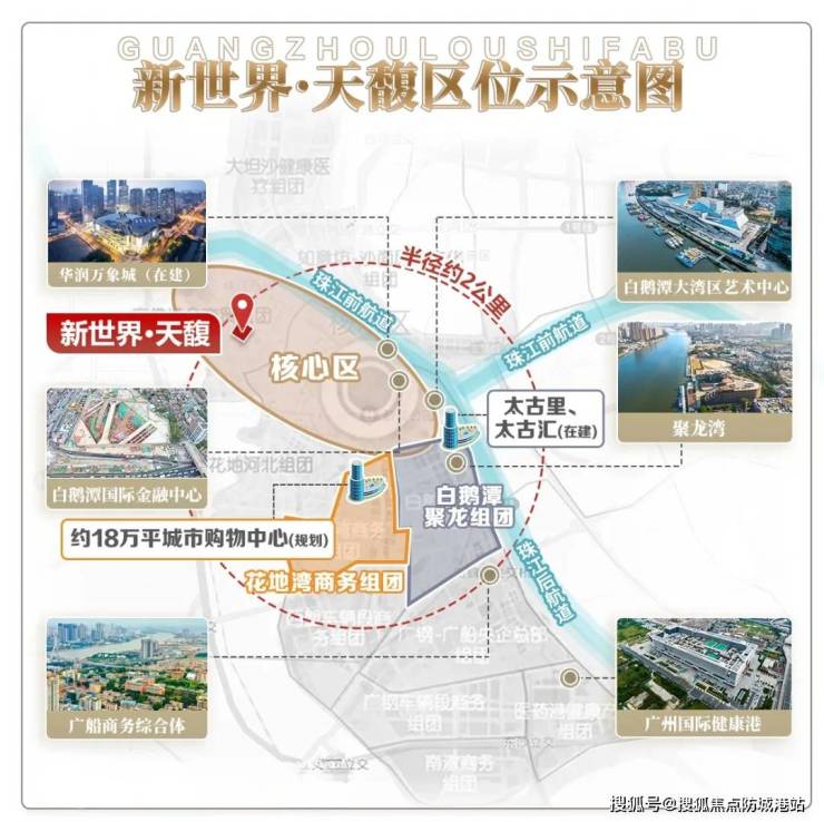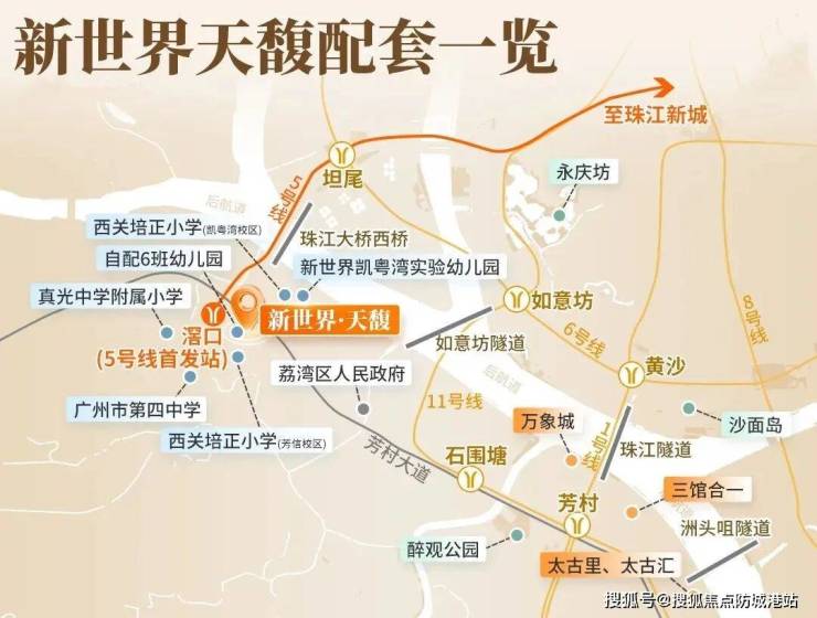 核心卖点一:主城区核心区位,通勤与配套双优:新世界·天馥位于荔湾滘口板块,紧邻白鹅潭CBD核心区域,属于广州主城区稀缺置业板块,地理位置得天独厚。周边商业、教育、医疗、交通配套成熟,同时临近珠江,拥有优质江景资源,既能享受主城区的便捷生活,又能坐拥自然景观优势,实现“繁华与静谧共生”的居住体验。