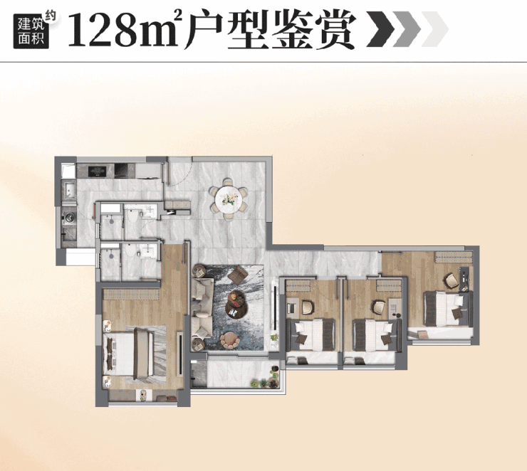 户型三:建面约128㎡五房两厅两卫(得房率79%):该户型为改善型主力户型,拥有五开间东南向阔绰望江面,超16米南向景观面,江园双景尽收眼底,视野比肩珠城顶豪。客厅开阔大气,能够容纳多人聚会,餐厅可放下6人圆桌,满足家庭聚餐需求;五个卧室空间宽敞,主卧配备独立卫生间与衣帽间,舒适度极高;户型灵活性强,两间次卧可打通为一间大房,适合父母同住,享受江景居住体验,适合大家庭或改善群体置业。