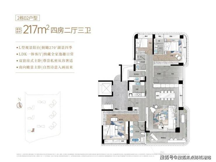 1-5座超大面宽巨幕采光面;6-8座270°超大转角L型景观阳台,设计转角边厅,打造“最完美的IMAX湖景”。