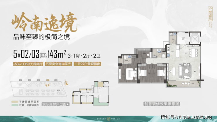 建面约 143㎡ 3+1 房两厅两卫户型:独立入户玄关,南北双阳台,LDKB 无界阔景通厅,主卧奢阔套房设计,项目主力爆款户型;