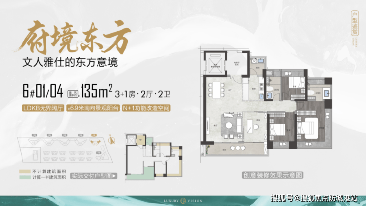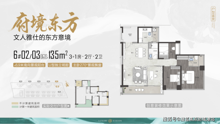 建面约 135㎡ 3+1 房两厅两卫户型:四开间朝南,约 6.9 米宽景阳台,动静分区,270° 主卧转角飘窗,高性价比改善首选;