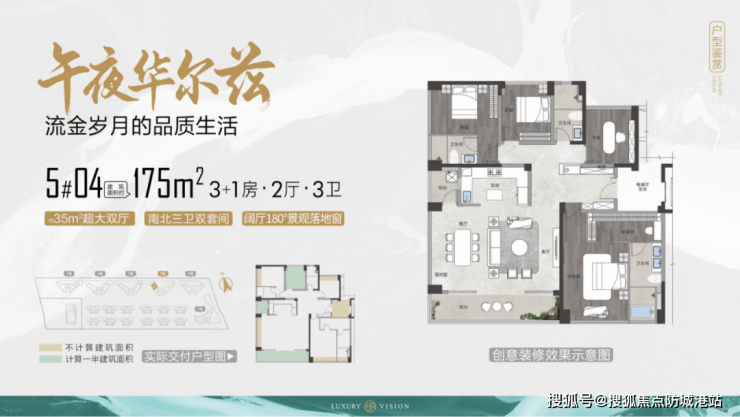 建面约 175㎡ 四房两厅三卫户型:南北双套间设计,超大一体化社交聚厅,灵动百变空间,五开间朝南,终极改善顶配户型。