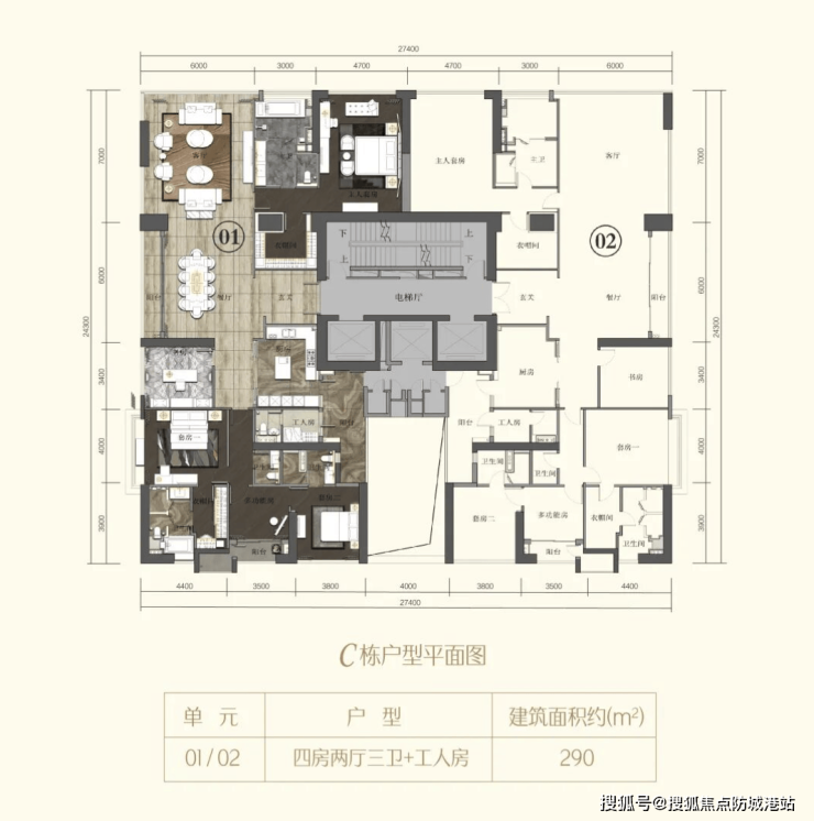 项目主力户型建筑面积约290㎡—315㎡,全部为四房两厅四卫,并配置独立工人房,完全按照高端家庭结构定制。户型强调大尺度客餐厅、宽阔景观面及明确的动静分区,兼顾家庭生活与社交需求。
