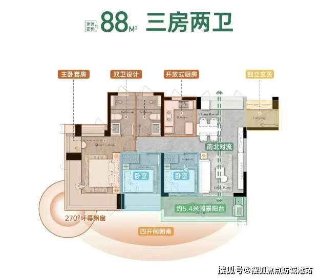 88平方米三房两卫:功能齐全,适合小家庭居住。