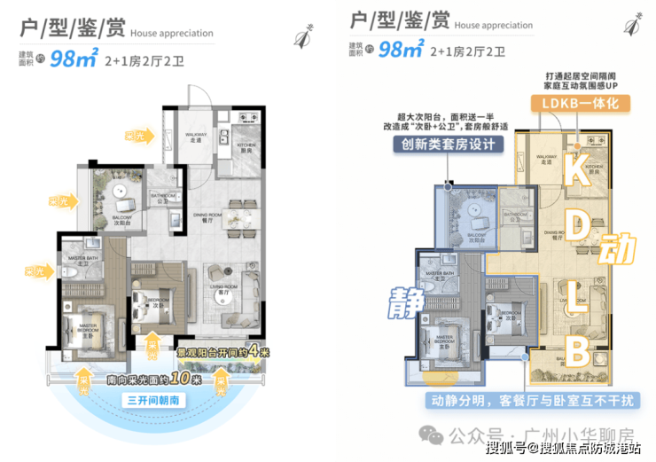 项目主推的户型涵盖多个面积段,从适合刚需的中小户型,到适合改善的大户型,全方位满足不同家庭的居住需求,且所有户型均为全南向设计,保证了极佳的采光与通风效果。建面约九十八平方米的 2+1 房户型,格局方正,三开间朝南,拥有宽敞的南向采光面,客厅与卧室动静分区,互不干扰。主卧采用套房设计,搭配二百七十度转角飘窗,视野开阔,采光充足。超大景观阳台不仅能俯瞰社区园林与外部景观,还能灵活改造为房间,一半面积的赠送让空间利用率大幅提升,对于刚需家庭来说,性价比极高。