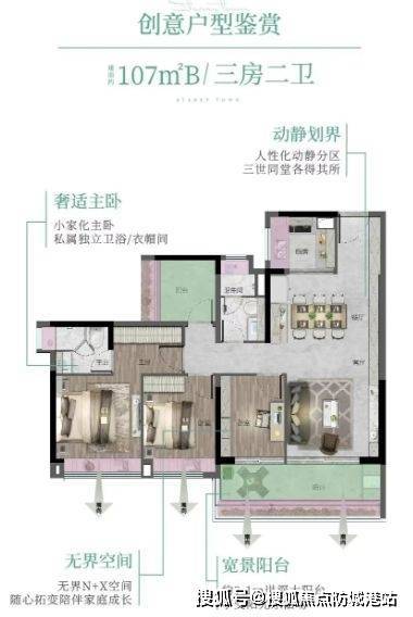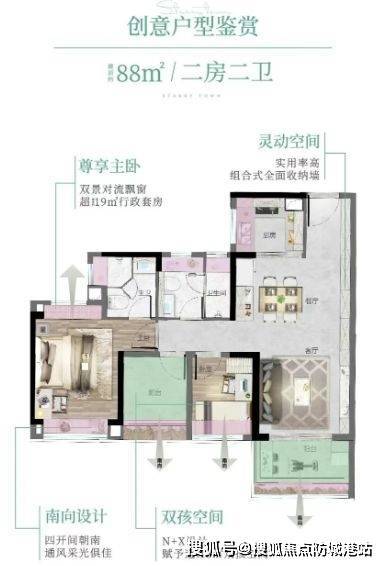 88㎡ 3空间2厅2卫:罕见四面宽小户型,三卧室朝南,超11米景观线,精细化收纳墙达约24000升。