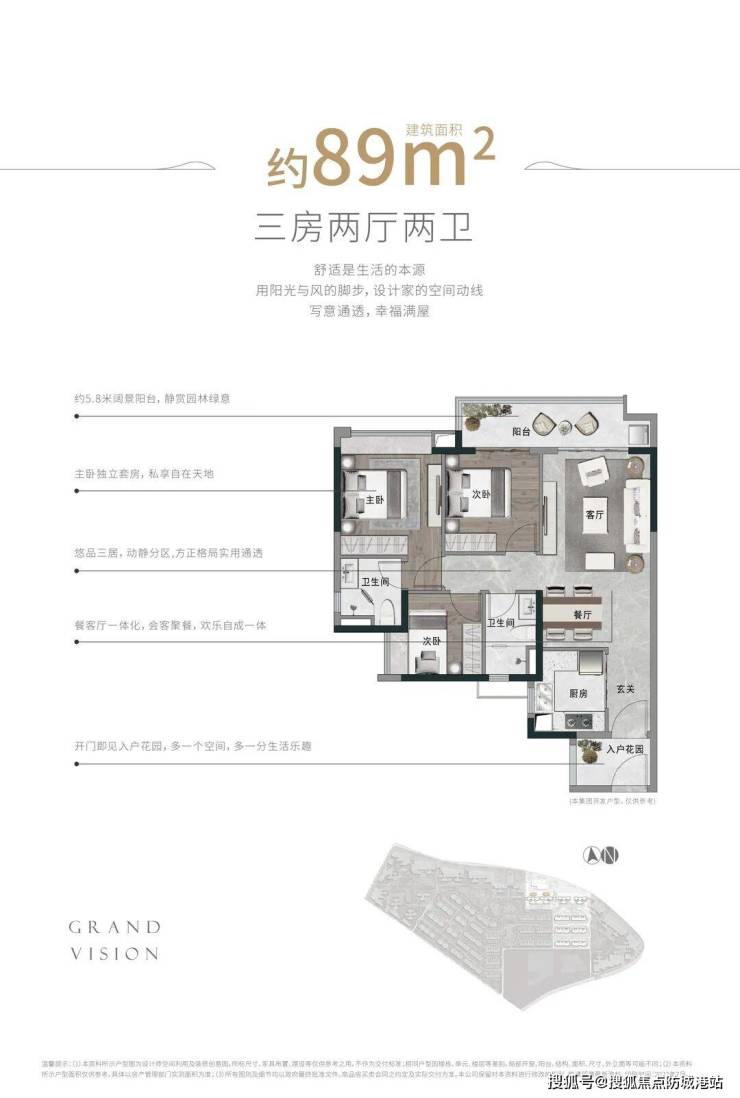 89㎡三房两厅两卫:约5.8米阔景阳台,主卧独立套房设计,餐客厅一体。