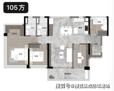 105㎡4 空间 2 卫:南北对流,通风极佳,主卧配备超享 U 型衣帽间,提升收纳与私密感;新规设计带来高使用率,空间尺度阔绰。