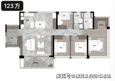 123㎡5 空间 2 卫:实现空间平权,南向卧室均可放置 1.8m 大床,满足多代同堂需求;全明设计,动静分区合理,居住舒适度高。