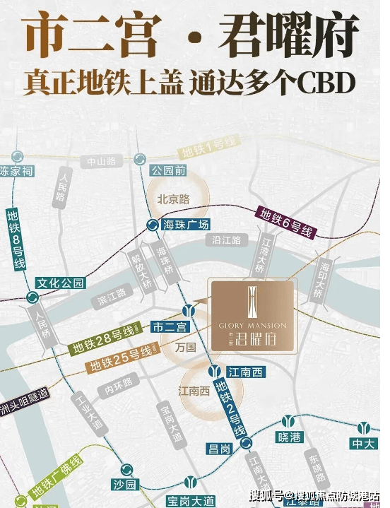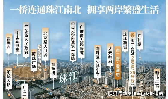 君曜府地处广州第一中轴南拓首站,紧邻珠江水脉,占据千年中轴正脉与珠江水脉的黄金交汇点。周边有地铁2号线和规划中的28号线(佛穗莞城际),距离市二宫站不到200米,出行十分便利。此外,项目周边还有江南大道、内环路等主干道,交通网络发达。区域内拥有丰富的历史文化底蕴,以及完善的商业配套设施,如万国广场、江南西商圈等,为居民提供了高品质的生活体验。