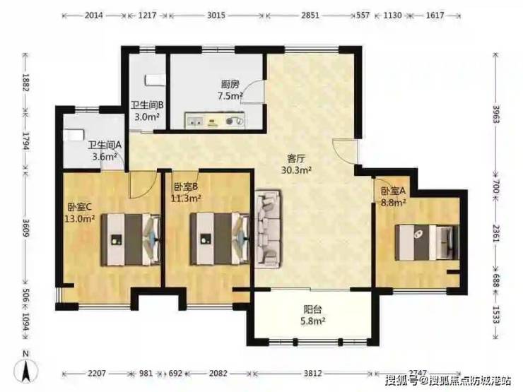 2.卧室全朝南无北房设计,让每个卧室都充满阳光;