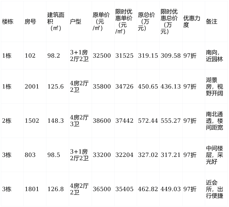 六、敏捷万博金湖壹号特价房表(2026年1月8日官方更新)