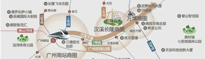 广州足球公园地处万长南黄金走廊的核心位置,左临广州南站,右接长隆-万博CBD,成为了连接两大国际商圈的超级流量入口。这一区域汇聚了大湾区内的人流、物流、信息流,形成了独特的地理优势。此外,项目距离地铁7号线谢村站仅300米,通过轨道交通可以轻松实现大湾区1小时生活圈。无论是前往琶洲还是珠江新城CBD,都只需短短的几十分钟车程。自驾出行同样方便快捷,项目周边有汉溪大道、广台高速、东新高速等多条重要干道环绕,确保居民能够快速通达广州乃至整个大湾区的主要城市。