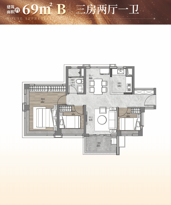- 69㎡三房一卫:荔湾区最小三房户型,得房率超100%,全南向设计,主卧三面飘窗,可改造灵活空间。