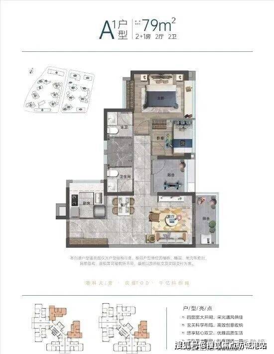 79㎡三房两厅两卫:这可能是当前市场上对小面积户型空间极限利用的一个案例。传统认知中,80平以下做两房是常态,三房已属难得,而它竟做到了三房两卫。户型方正,南北对流,南向客厅连接阳台。主卧带独立卫生间和全景飘窗,私密性好。这个户型非常适合首次置业的年轻家庭或单身精英,以较低总价获得完整的三房功能。