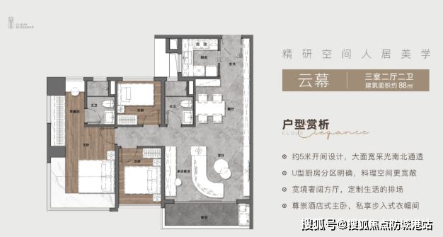88平方米三房两厅两卫:采用蝶式塔楼设计,采光通风良好,适合刚需家庭。