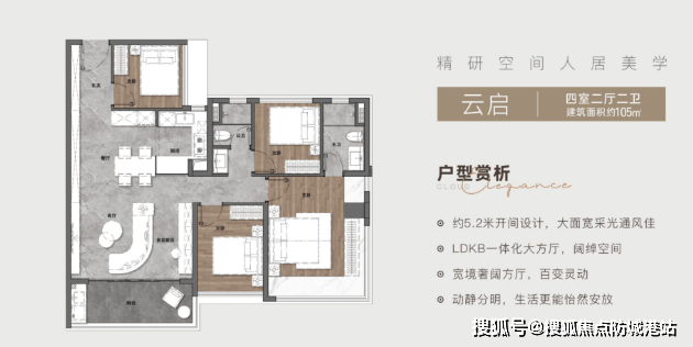 105平方米四房两厅两卫:空间布局合理,功能分区明确,满足多代同堂的需求。