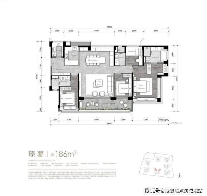 户型:主推110㎡四房(总价510万起)、141㎡五房(总价647万起)、186㎡大平层(总价902万起),得房率高达92%。