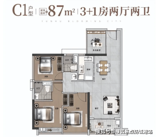 总价约 320 万起,首付最低 48 万起。核心亮点:四开间朝南,客厅与次卧共享约 6.8 米跑道式阳台,视野开阔;主卧套间带独立卫浴与衣帽间,实用面积达 15㎡;N+1 灵动空间可改造为儿童房或老人房,满足二胎家庭需求;实测使用率 92%,实得面积约 87.4㎡,对比同区域 100㎡四房,总价低 30 万起,空间利用率更优。
