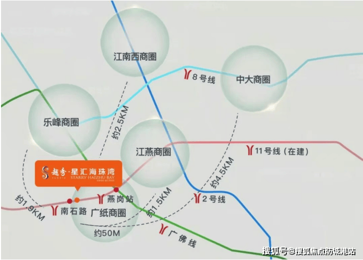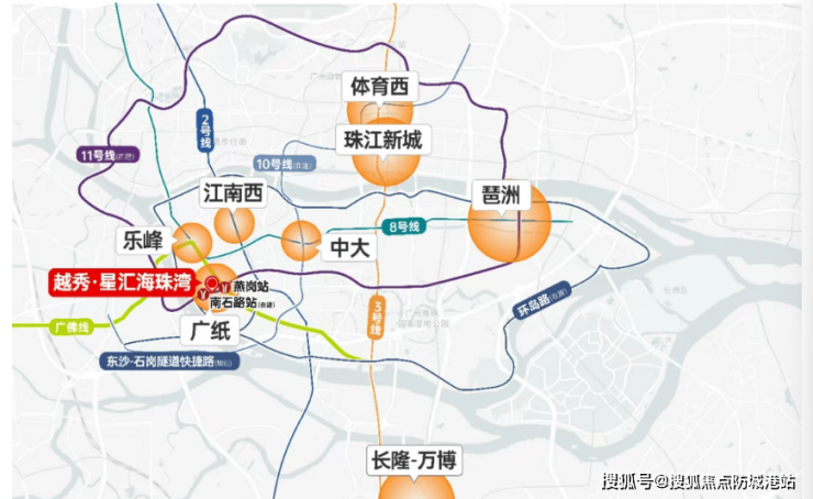 ◦ 交通:双地铁覆盖,立体交通网络通达全城,是板块内交通优势最突出的项目。地铁方面,距广佛线燕岗站仅 500 米,步行 6 分钟可达,向西 30 分钟直达佛山禅城、桂城,向东接驳 2、3 号线,20 分钟直达珠江新城、体育西路,15 分钟抵达客村、琶洲,通勤效率拉满;楼下即是地铁 11 号线(在建)南石路站,预计 2026 年底通车,广州首条环城地铁,串联天河、海珠、荔湾、越秀、白云五大中心区,途经广州东站、广州火车站两大交通枢纽,30 分钟覆盖全城核心板块,开通后将成为项目交通核心利好,房价增值空间进一步打开。自驾方面,紧邻工业大道、昌岗中路、广州大道等城市主干道,5 分钟上内环路,10 分钟达广州大桥,20 分钟直达珠江新城、白云新城,无堵车困扰;门口就是纸厂路公交站,963、469、544、75 路等 10 余条公交线路途经,覆盖海珠、越秀、荔湾全域,地铁 + 自驾 + 公交三维交通,满足所有出行场景。