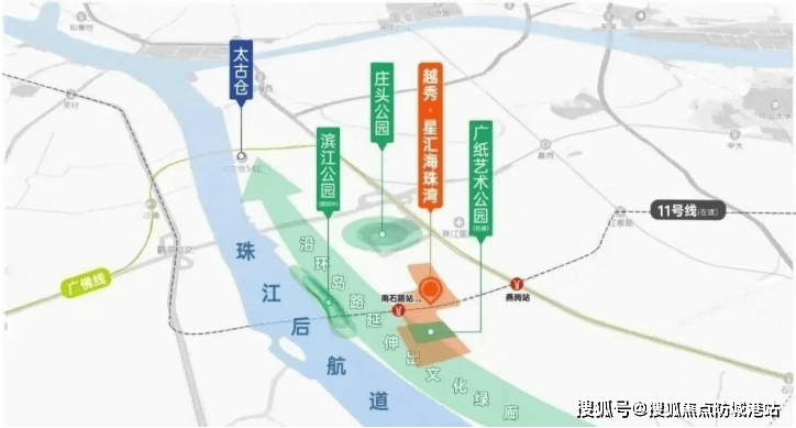 ◦ 未来利好:三大核心利好加持,未来价值持续攀升。1. 地铁 11 号线通车:2026 年底南石路站通车,项目成为地铁上盖物业,交通便利性大幅提升,参考广州历史数据,地铁开通后周边物业涨幅 15%-25%,项目增值空间明确。2. 海珠创新湾建设提速:2026 年创新湾启动沿江高端产业带建设,引进总部企业、数字经济、文创产业,未来 3 年新增就业人口超 5 万,租赁需求、居住需求爆发,项目租金、房价双重受益。3. 广纸新城配套升级:2026-2028 年片区新增 3 所小学、2 所中学、3 个社区公园,滨江公园建成开放,商业配套进一步完善,居住价值持续提升。三大利好叠加,项目当前 3 万 + 单价处于价值低位,未来 2-3 年涨幅可期。