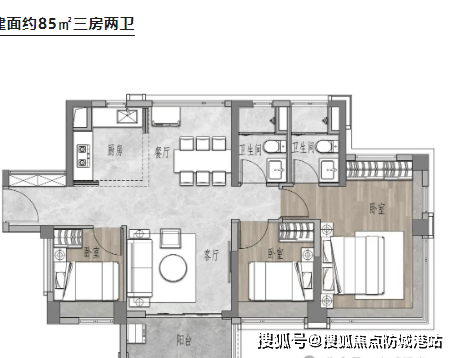 85㎡三房两卫:竖厅格局可改造为 6 米开间大方厅,比肩 100㎡以上户型,客厅与三间卧室全南向,采光极佳,主卧带套间与三面飘窗,适合三口之家;