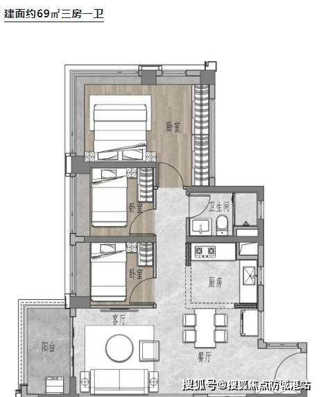 69㎡三房一卫:公区可做到南北对流,次卧打通后能形成阔绰方厅,主卧带三面飘窗(270° 景观 + 整面大衣柜),实际空间感堪比 80㎡以上户型,全盘仅 62 套,是板块内稀缺的 “低总价三房”,适合预算有限的刚需家庭;
