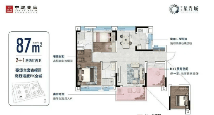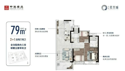 中建星光城提供的户型面积从69到100平方米不等,涵盖三房至四房的设计,所有户型均采用纯南向布局,确保每户都能享有充足的阳光照射。例如,69㎡三房一卫户型,总价160多万即可购买;79㎡三房二卫户型,总价约为180-210万左右。这些精致刚需户型不仅空间使用率高,而且实用性强,能够满足不同家庭的需求。