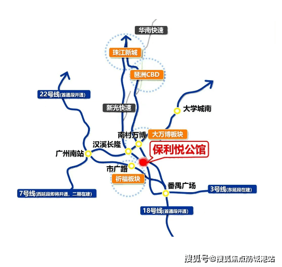 答:自驾 10 分钟到万博、30 分钟到珠江新城,门口有公交和片区巴士,可接驳地铁 22 号线,出行便捷。