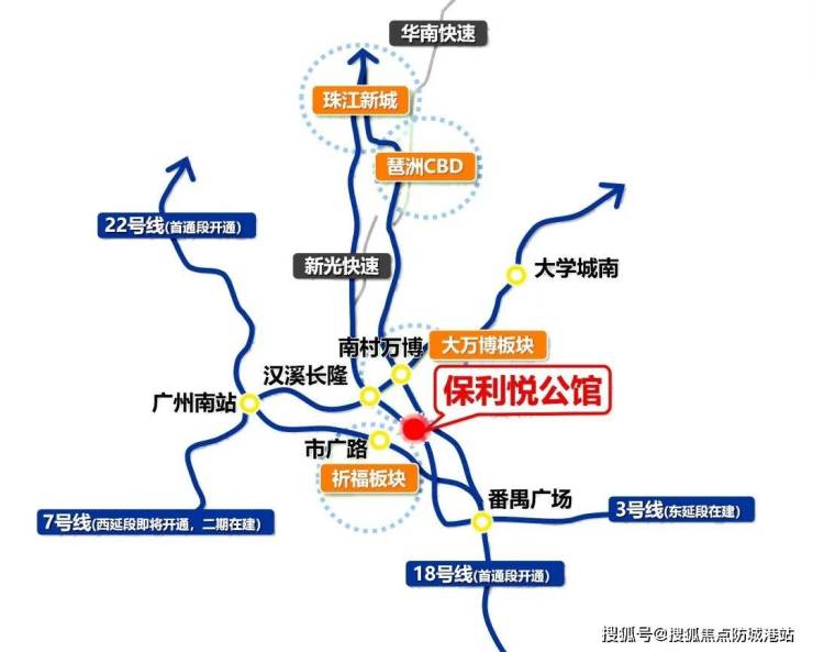 交通方面,保利悦公馆拥有 5 横 5 纵的密集交通路网。5 横包括新光快速、华南快速、番禺大道、市广路、东新高速;5 纵涵盖汉溪大道、南大干线(建设中)、广明高速、东环路、兴业大道。开车出门即达新光快速,10 分钟可达万博,25 分钟可达琶洲,30 分钟可达珠江新城,自驾出行极为便利。项目门口设有公交总站,虽距离最近的 22 号线市广路站直线距离约 1km,步行约 2 公里、需时约半小时,但富豪山庄、金山谷的片区交通巴士在悦公馆门口设站,约 8 分钟一班,可直达汉溪长隆站,一定程度上弥补了地铁通勤的不便。