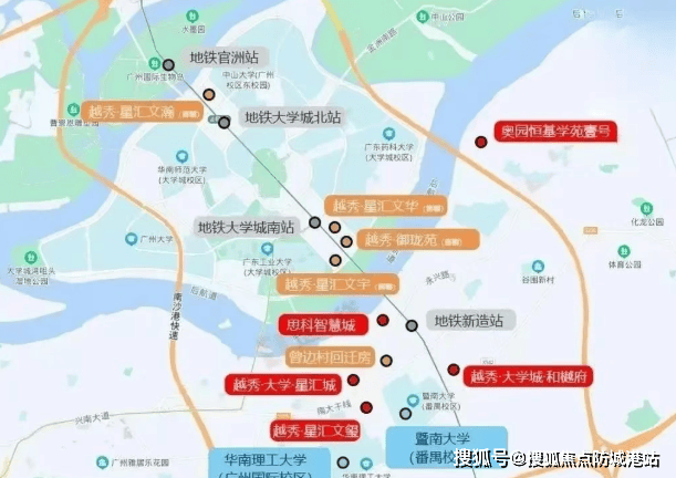 越秀大学城和樾府坐落于国际创新城的核心区域,紧邻地铁4号线新造站,交通便捷。周边有南大干线贯穿,驾车前往番禺万博CBD仅需几分钟时间。此外,项目周围环绕着13所高校,包括暨南大学、广州医学院等知名学府,形成了浓厚的学术氛围和高知人文圈层。项目自带约25万㎡中央公园,其中约11万㎡古树公园已由越秀地产配建完成,为居民提供了一个宜居生态环境。