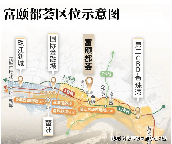 富颐都荟的地段优势堪称 “先天禀赋”。项目地处 “珠 - 金 - 琶 - 鱼” 珠江黄金 8 公里发展带,隶属广州第二 CBD 核心区,这片占地 59 平方公里的区域相当于 10 个珠江新城,由国际金融城、临港经济区、琶洲形成黄金三角,是广州未来发展的重点板块。