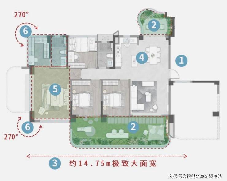建面约125㎡四房:四开间朝南,双阳台设计,主卧270°转角飘窗,江景视野无遮挡;