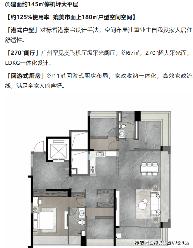 建面约145㎡停机坪大平层,是项目的特色户型,经官方认证,该户型采用超新规设计,使用率高达125%,媲美市面上180㎡户型空间,同时采用港式豪宅设计手法,空间布局注重业主自我及家人居住舒适性,纯南向全板式设计,南北对流,270°超大采光面,是追求极致空间体验的改善家庭的首选。